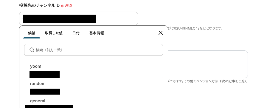 次の画面の「投稿先のチャンネルID」は入力バーをクリックすると、アカウントに基づいた情報が展開されます。