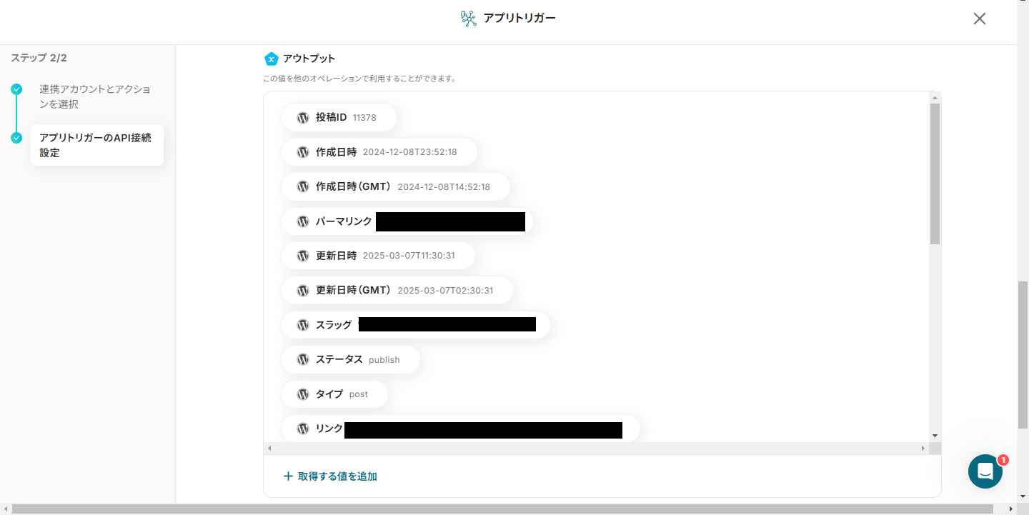 『取得した値』は、「この値を他のオペレーションで利用することができます。」という注釈の通り、この後のステップで引用・活用できます。