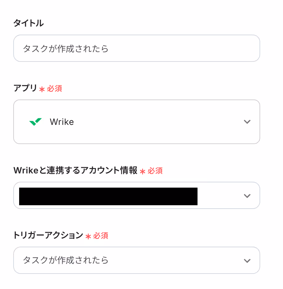 「トリガーアクション」:デフォルトで「タスクが作成されたら」が選択されているので、そのままでOKです!