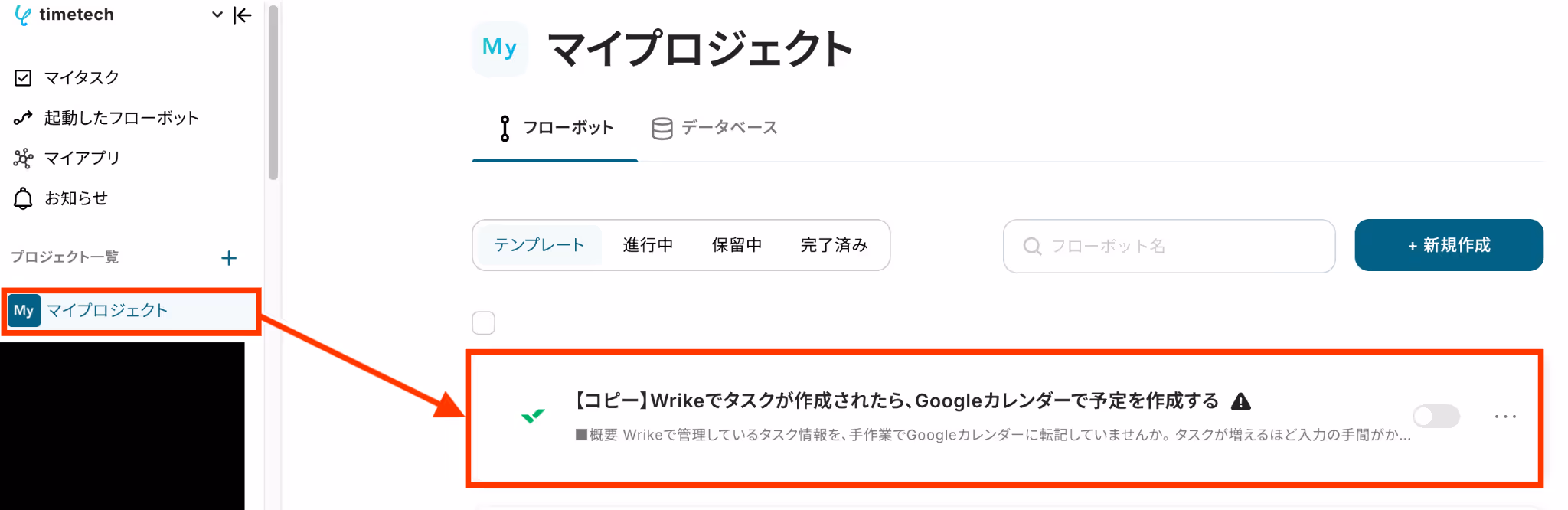 左側にあるメニューの「マイプロジェクト」から、コピーしたテンプレートを開きます。