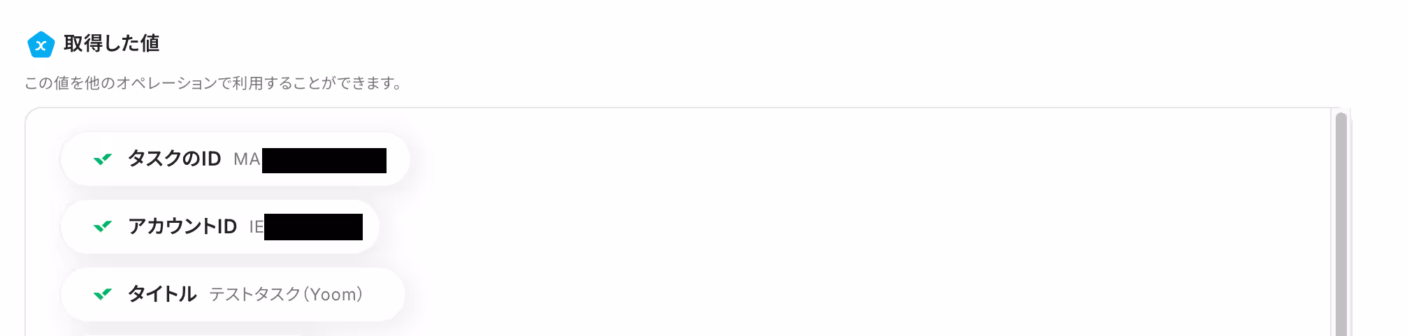 テストに成功すると「取得した値」としてWrikeのタスク内容がアウトプットされます。