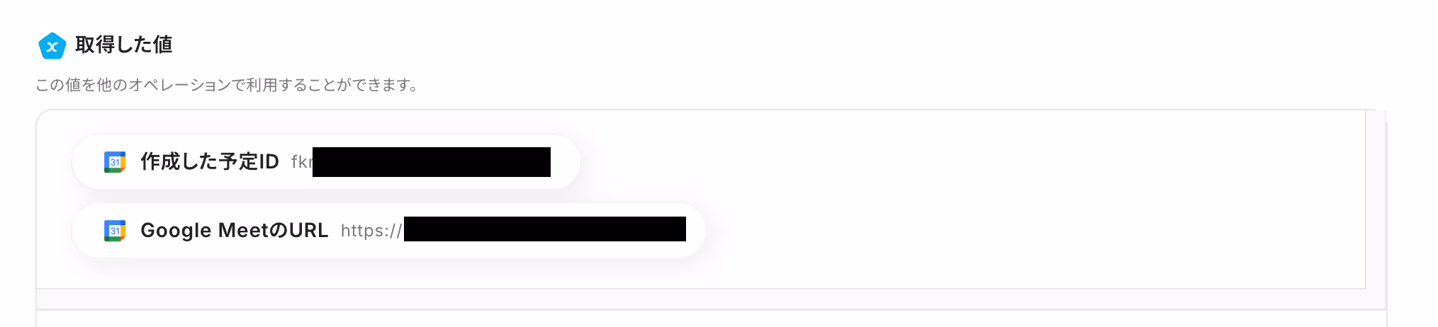 テストに成功すると「取得した値」としてGoogleカレンダーのデータが取得されます。