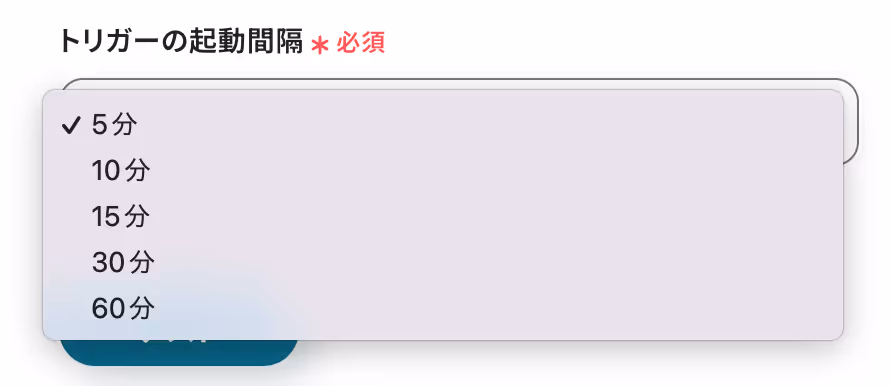 準備が完了したら「トリガーの起動間隔」を5分・10分・15分・30分・60分から選択します。