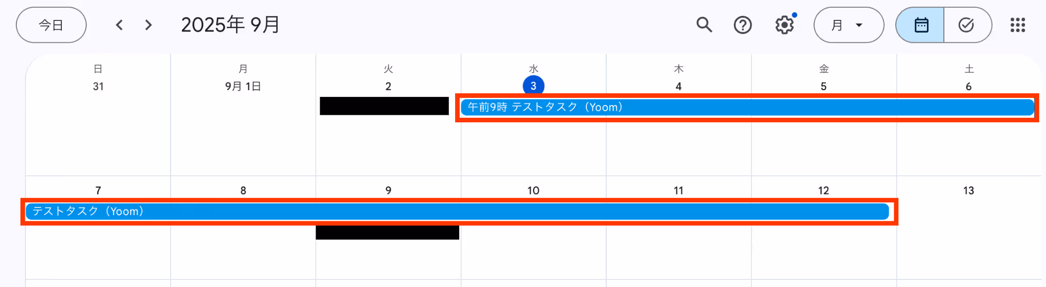 Googleカレンダーの画面でもタスクの予定が反映されていることを確認しましょう。