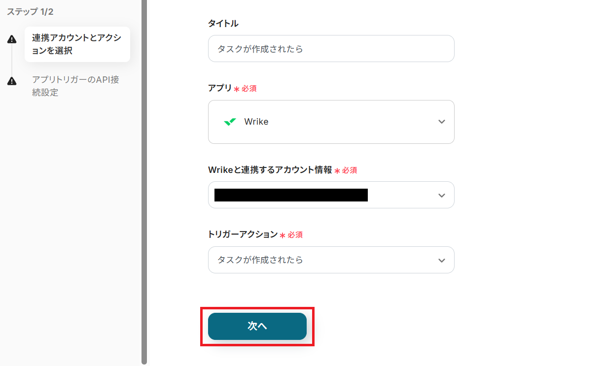 まずはタイトルを任意で設定し、Wrikeと連携するアカウントやアクション内容を確認したら「次へ」を押してください。アカウント情報は基本的にマイアプリ登録で連携したアカウントが選択されています。