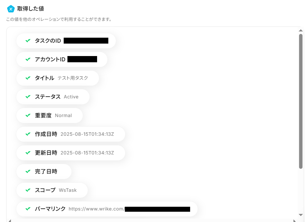 タスクを作成できたら、Yoomに戻って「テスト」ボタンを押してみてください。以下のように「取得した値」として先ほど作成したタスクの内容が反映されていれば、テストは成功です!
