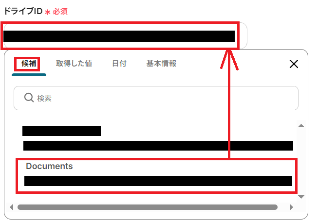 親フォルダの名前を入力すると、その下にある「親フォルダのアイテムID」に候補が表示されるようになります。