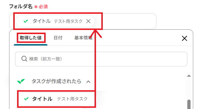 前のステップで取得した値を用いることで、今後新しくWrikeにタスクが作成される度に、新しいタスク名を反映したフォルダが作成されることになります。