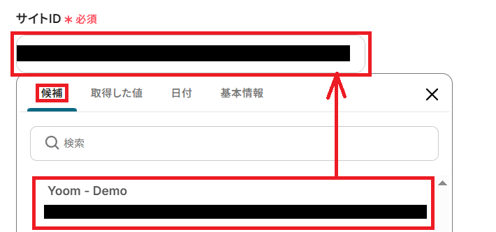 フォルダを作成する場所を設定していきます。「サイトID」のボックスをクリックして、連携しているMicrosoft SharePointの候補となるサイトIDから任意のものを選んでください。