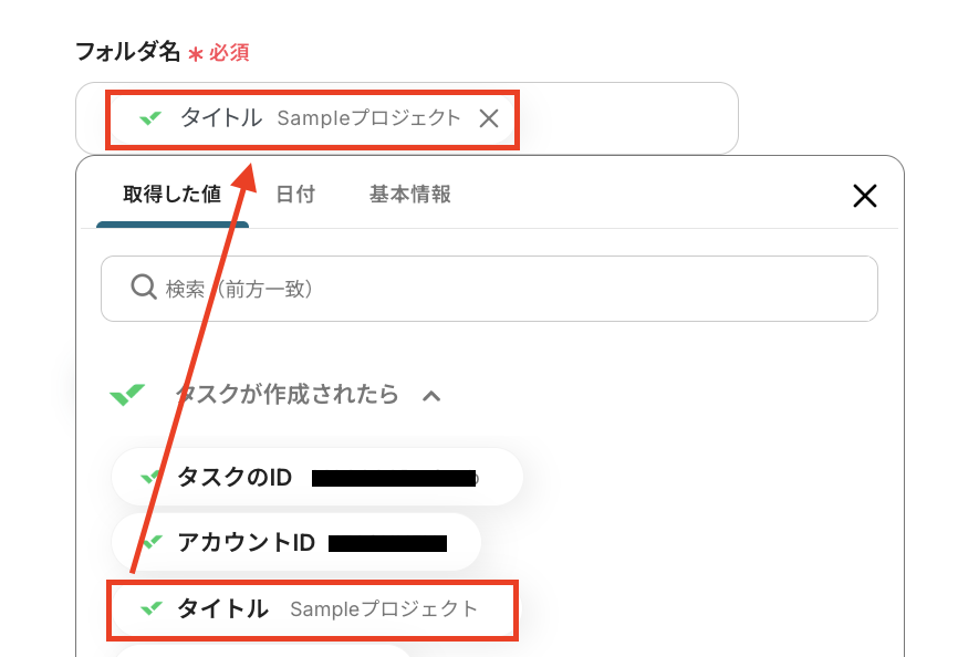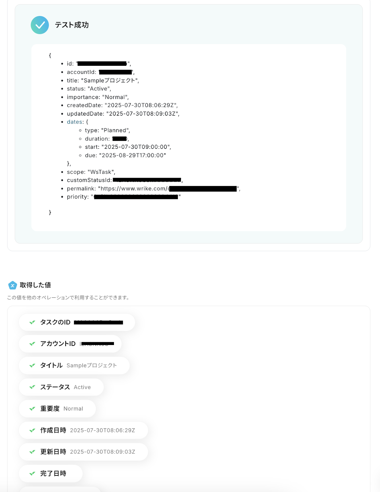 テストが成功すると、先ほど作成したタスクの情報が「取得した値」にアウトプットとして抽出されるので、内容を確認しましょう。