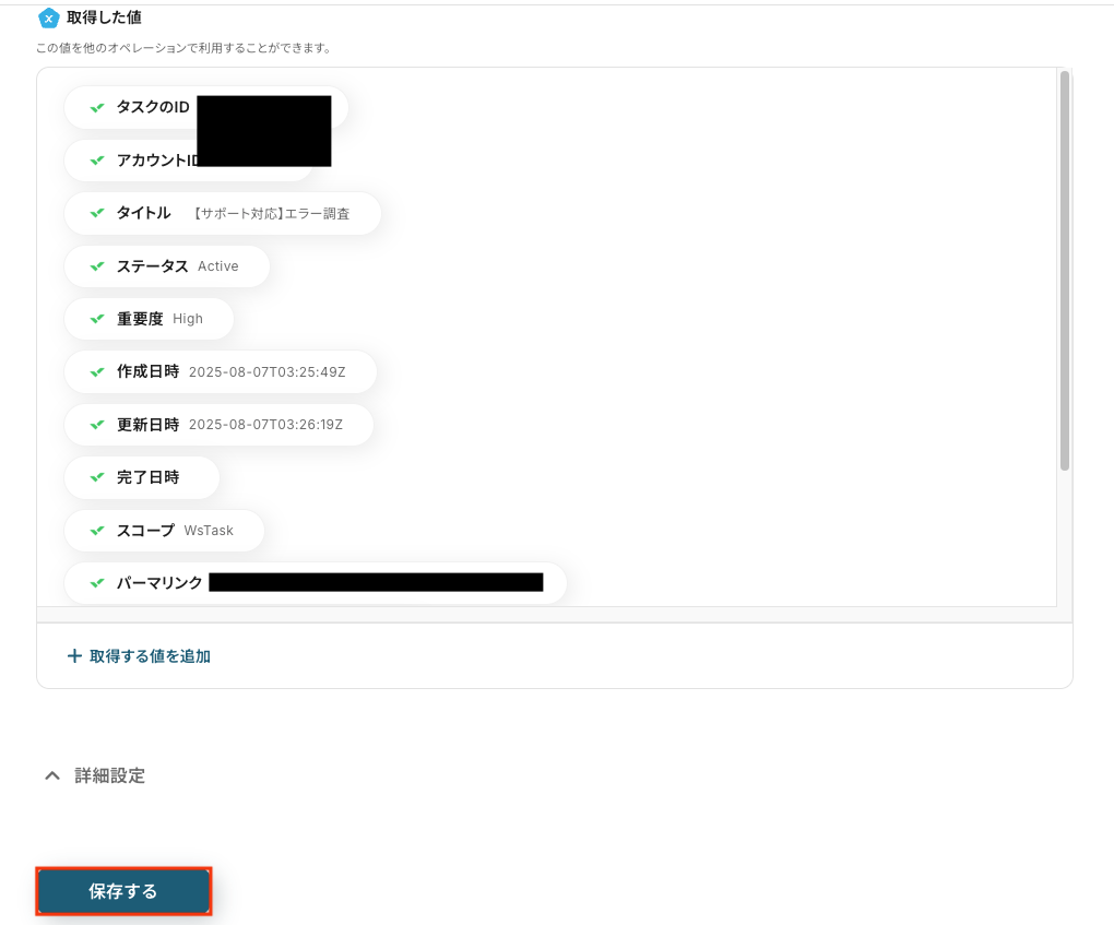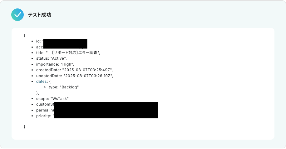 テストに成功すると、Wrikeに作成されたタスクに関する情報が一覧で表示されます。
