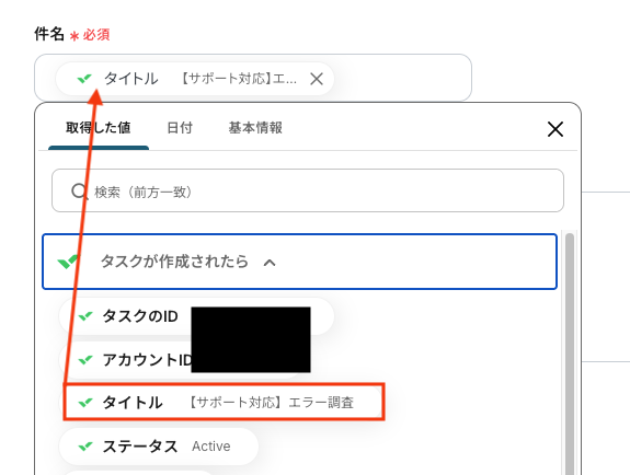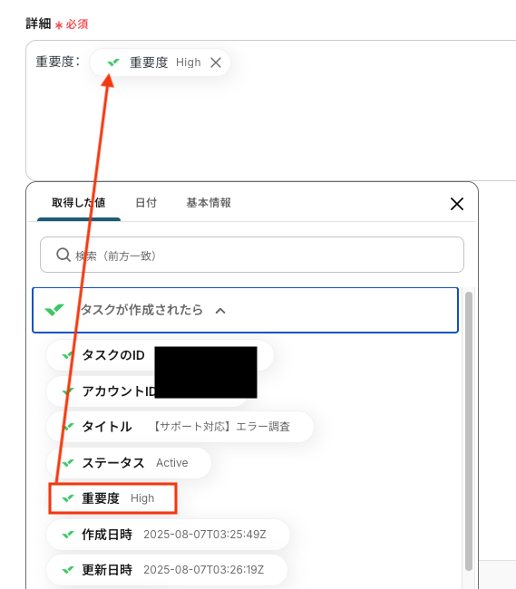 入力欄をクリックすると、前のステップでWrikeから取得済みのアウトプットが表示されるので、選択して入力しましょう。