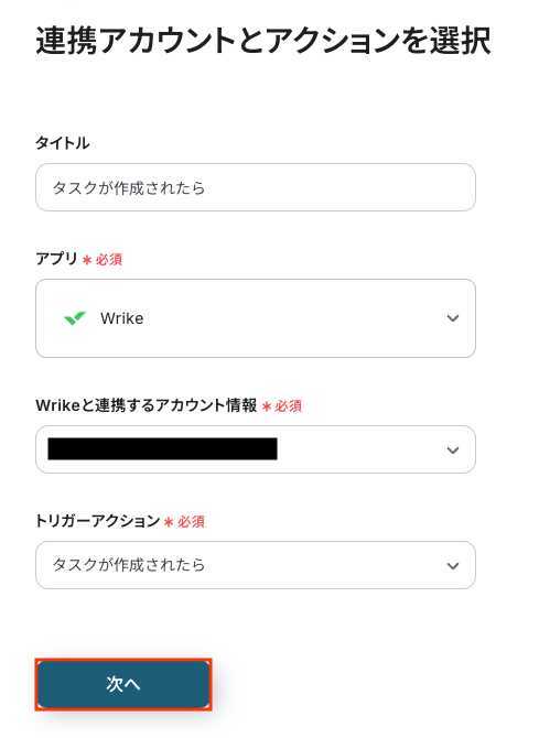 Wrikeと連携するアカウント情報に問題がなければ、「次へ」をクリックします。
