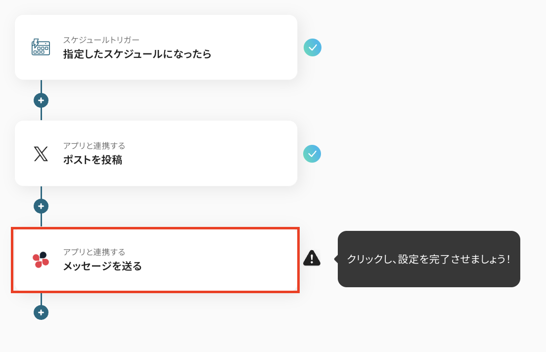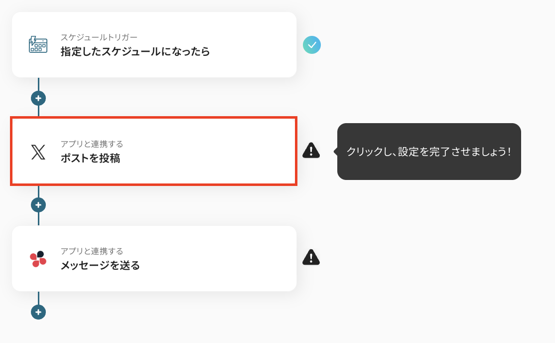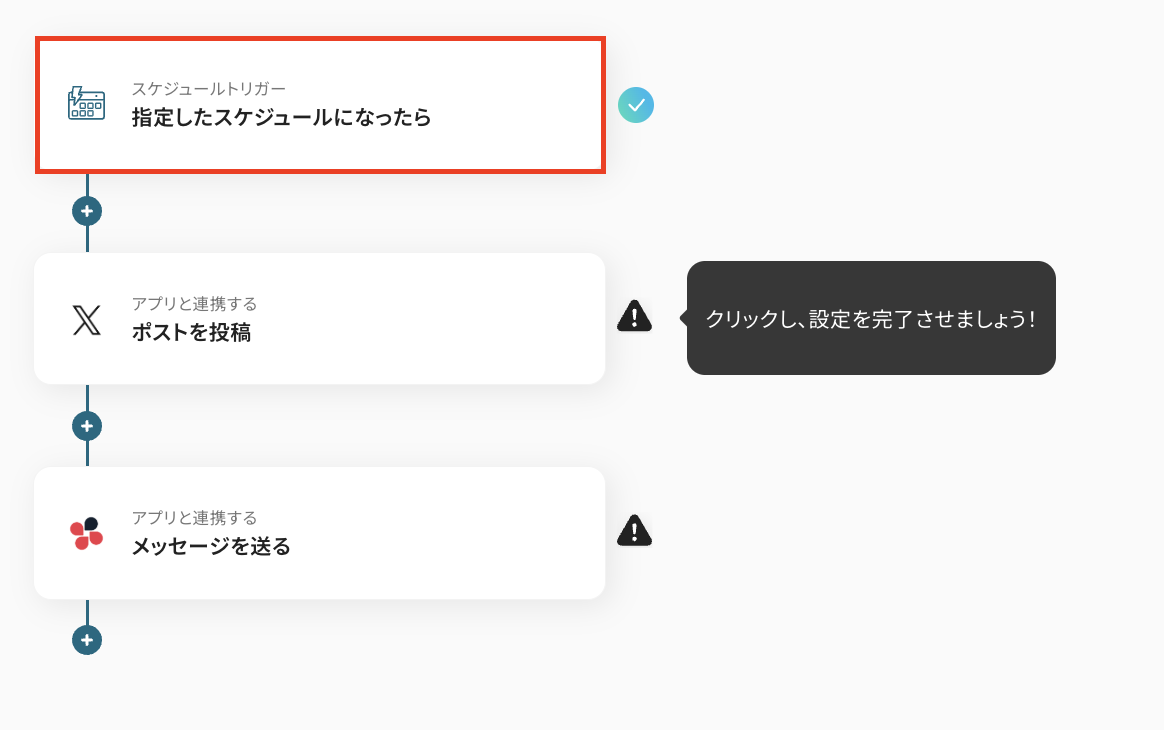 ここでは、X(Twitter)にポストを投稿し、Chatworkに通知するスケジュールを指定します。