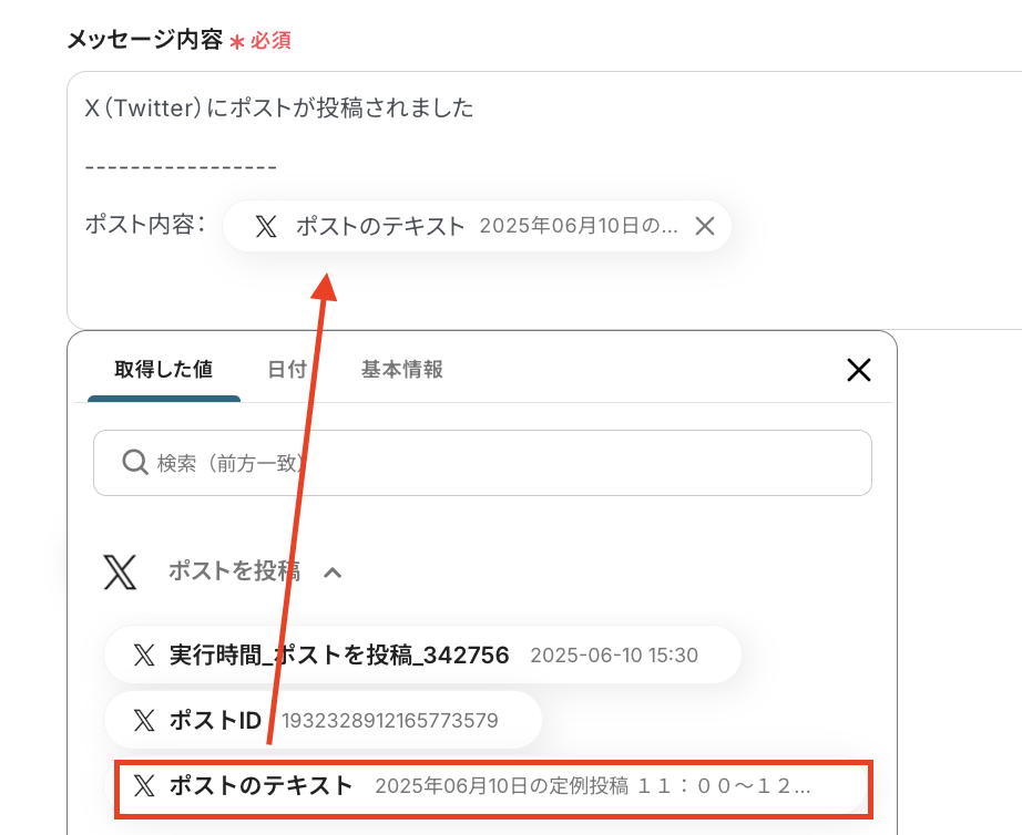 メッセージ内容:通知するメッセージの内容を設定します。「X(Twitter)にポストが投稿されました。」など、毎回同じテキストを使用する定型的な文章は直接入力し、「ポストされた内容」などX(Twitter)に投稿された情報を引用する部分はアウトプットを使って入力しましょう。