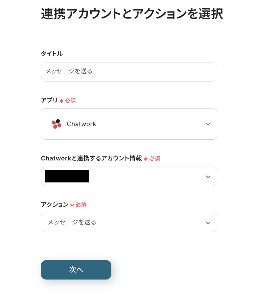アクションは「メッセージを送る」のままにして、「次へ」を押します。