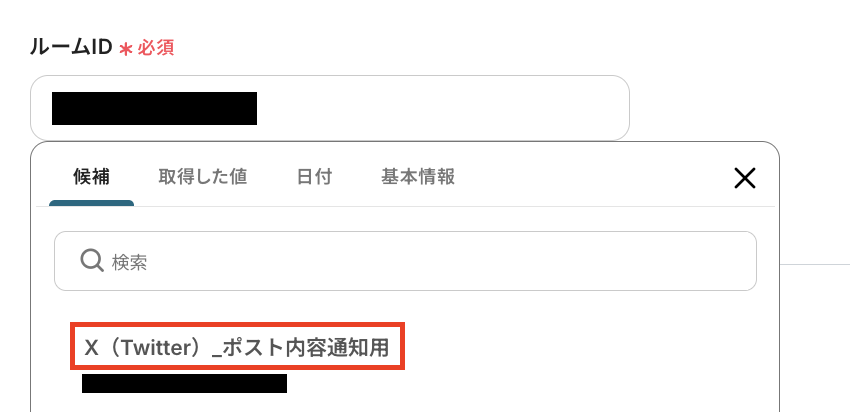 ルームID:X(Twitter)に投稿された内容を通知するChatworkのルームを設定します。入力欄をクリックすると、連携しているアカウントに紐づいて候補が表示されるので、候補から該当のルームを選択してください。