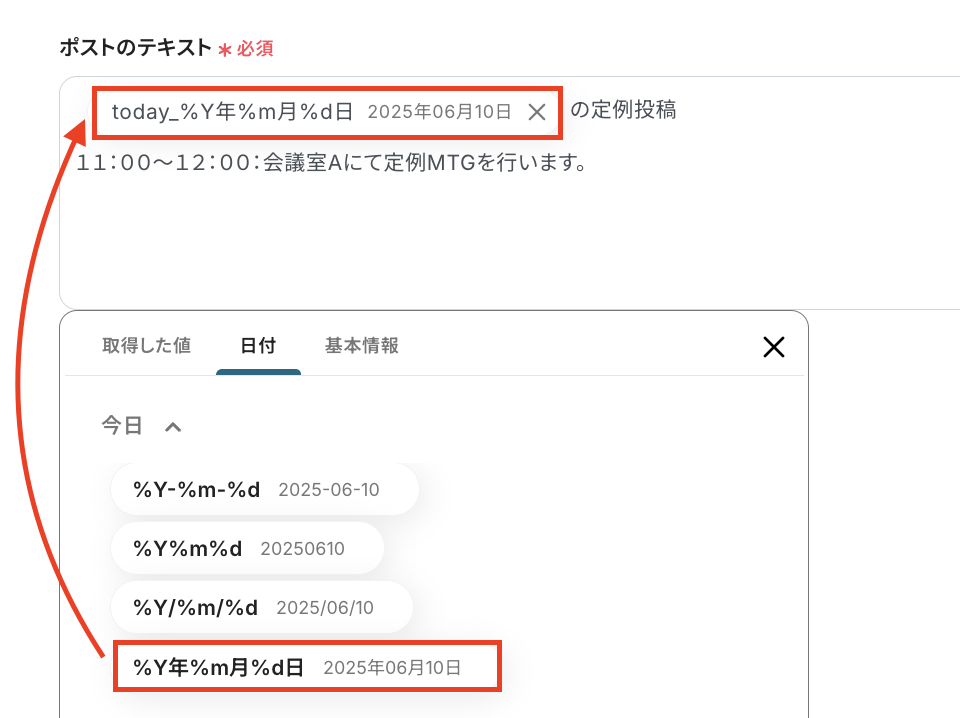 たとえば「定例投稿です」など毎回同じテキストを使用する定型的な文章は直接入力し、日付など変動する値を使用したい場合は、アウトプットを使って入力してくださいね!