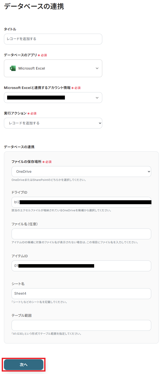 その他、シート名やテーブル範囲などを入力します。