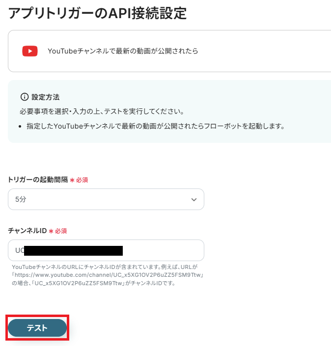 チャンネルID:YouTubeの自身のチャンネルのURLから注釈を確認しながら、IDを入力します