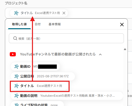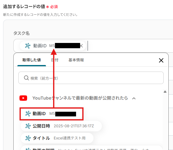 追加するレコードの値を「取得した値」の「YouTubeチャンネルで最新の動画が公開されたら」から選択していきます。