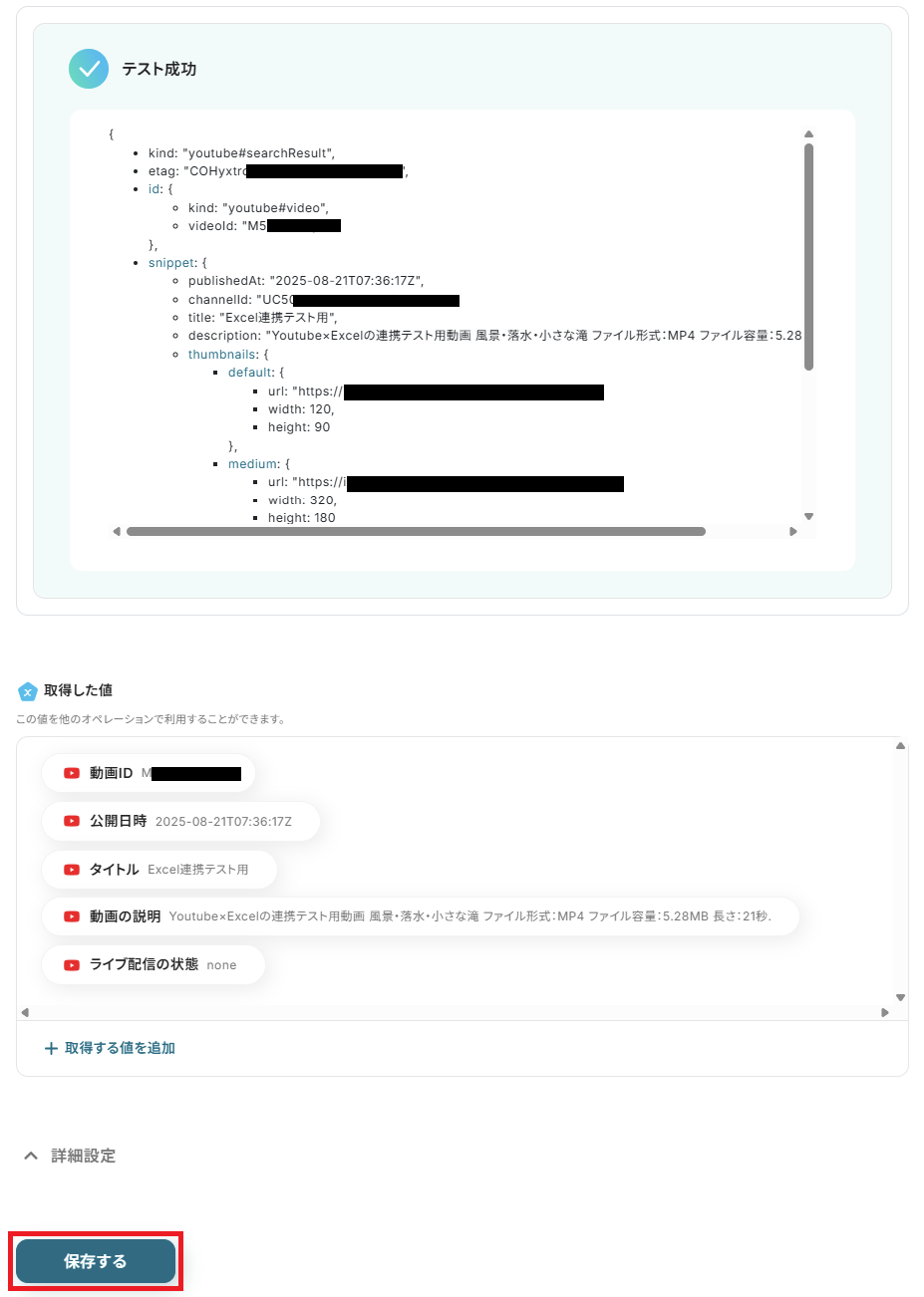 テストが成功したら、下部にある「保存する」をクリックします。