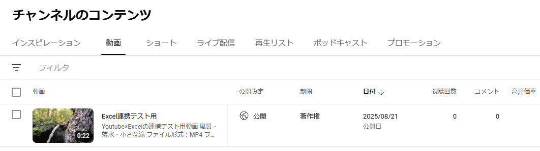 連携したアカウントにテストで動画をアップロードしておきます。