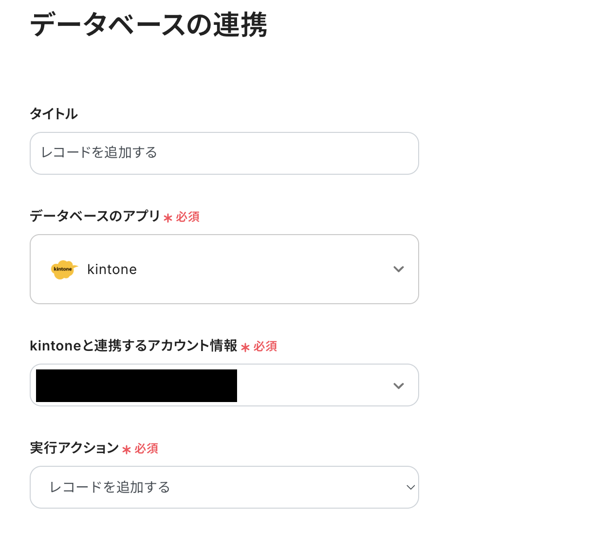 - オペレーションでkintoneを選択し、「レコードを追加する」アクションを設定し、条件に合致した動画のタイトル、URL、公開日時などの情報をkintoneの指定したアプリにレコードとして追加します。