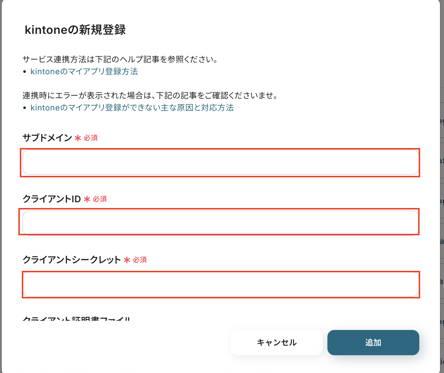 サブドメイン、クライアントID、クライアントシークレットを入力し、追加をクリックしてください。