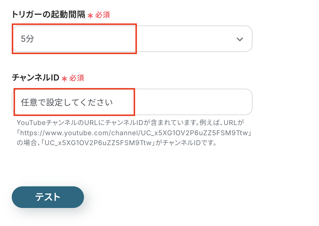 - YouTubeの「YouTubeチャンネルで最新の動画が公開されたら」トリガーでは、ご自身のYouTubeチャンネルIDを任意で設定してください。