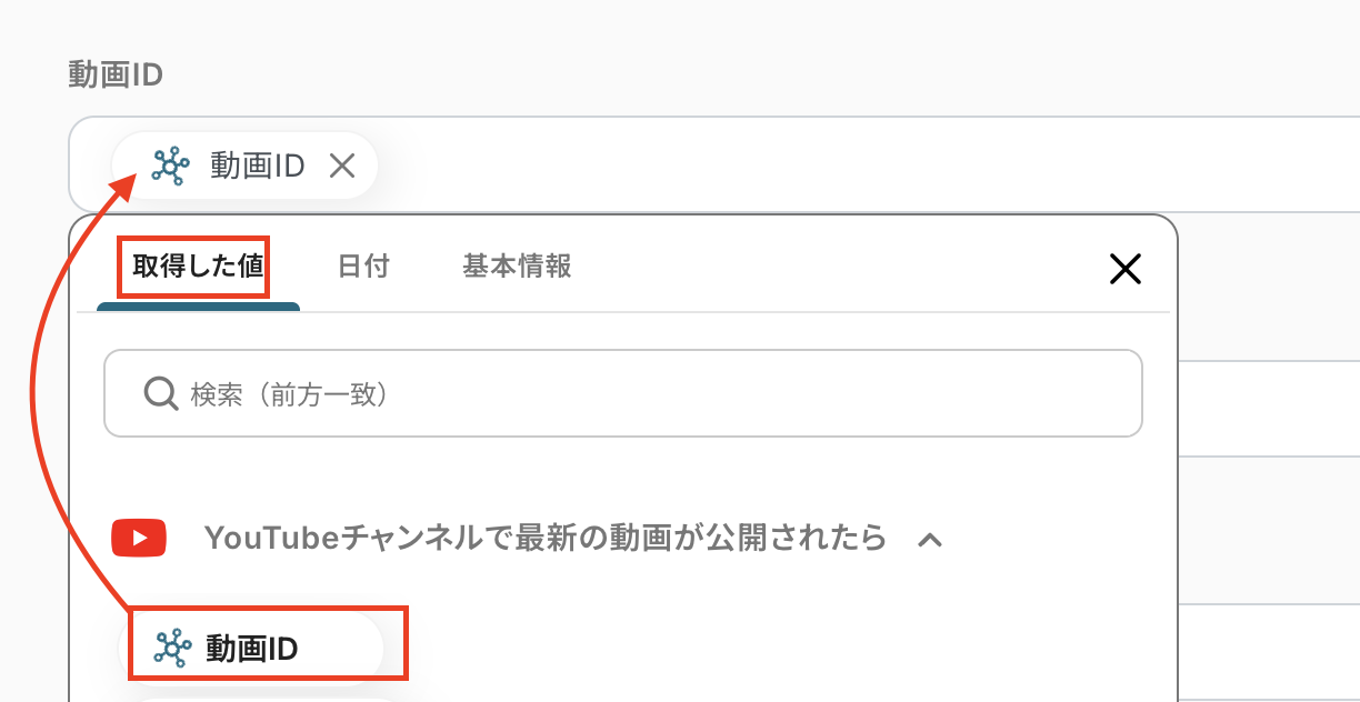 ここでは、Youtubeの設定で取得したアウトプット を活用しましょう! 取得した値を使わずに手入力した場合、同じ内容が繰り返しkintoneに追加され続けることになりますので、注意してください。
