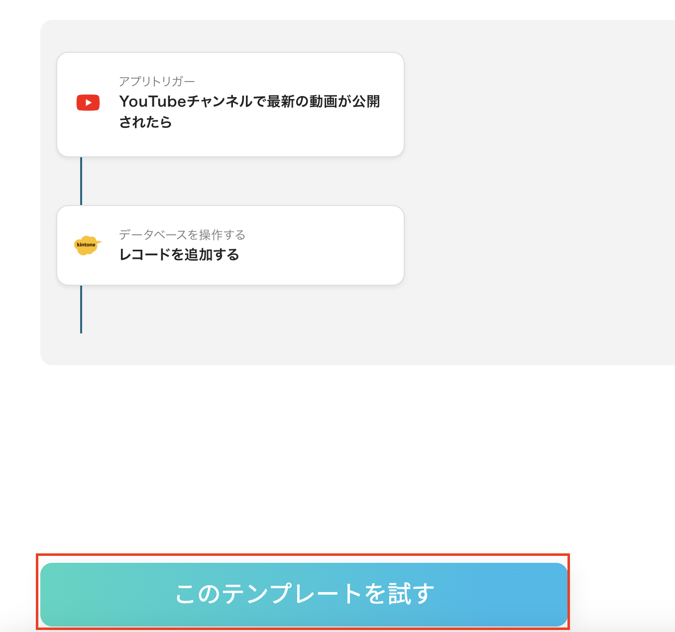 ご紹介する自動化例のバナーをクリックしてテンプレート詳細を確認し、アカウント登録するだけで、すぐにYouTubeとkintoneの連携を実際に体験できます。