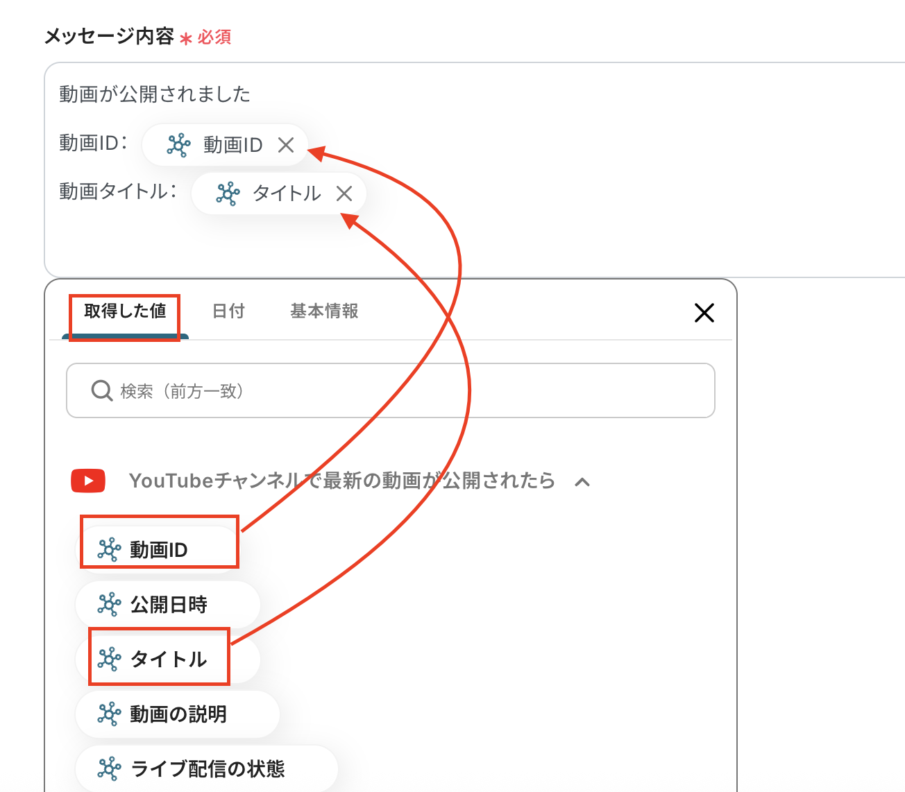 YouTubeの動画情報がわかりやすいように、動画IDやタイトルを、YouTubeの取得した値から選択して設定しましょう。