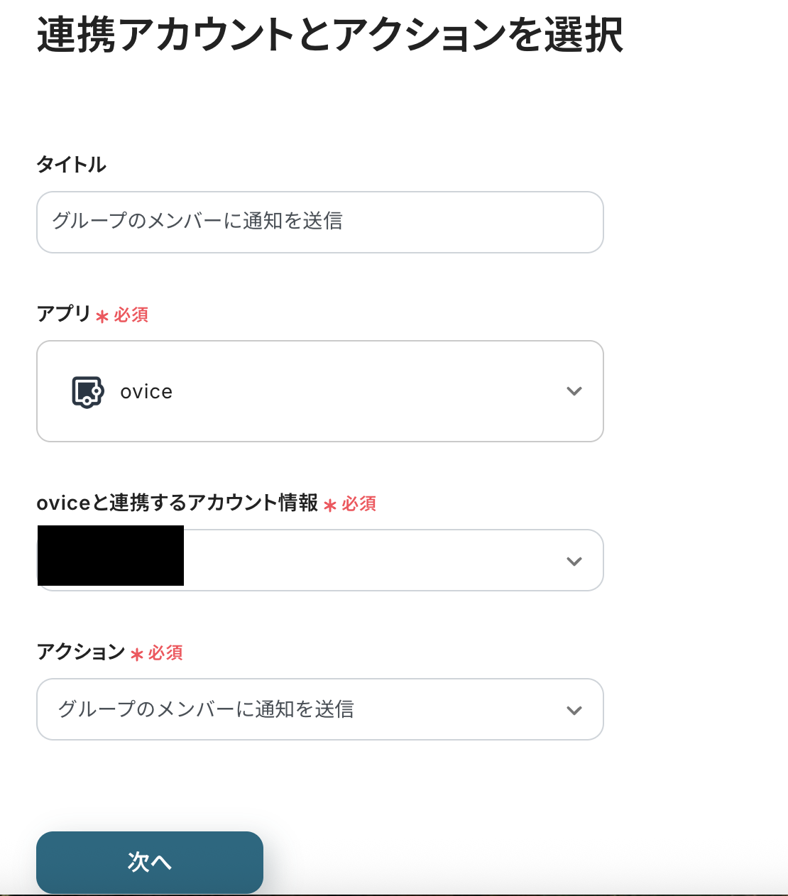 oviceと連携するアカウント情報とアクション(グループのメンバーに通知を送信)を確認し、次へをクリックしてください。