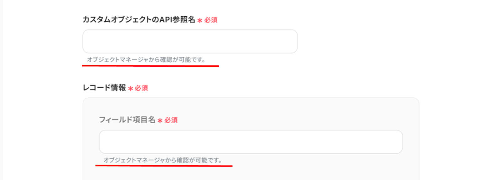 (3)「API接続設定」画面から、赤線を確認の上、「カスタムオブジェクトのAPI参照名」と「フィールド項目名」を入力します。