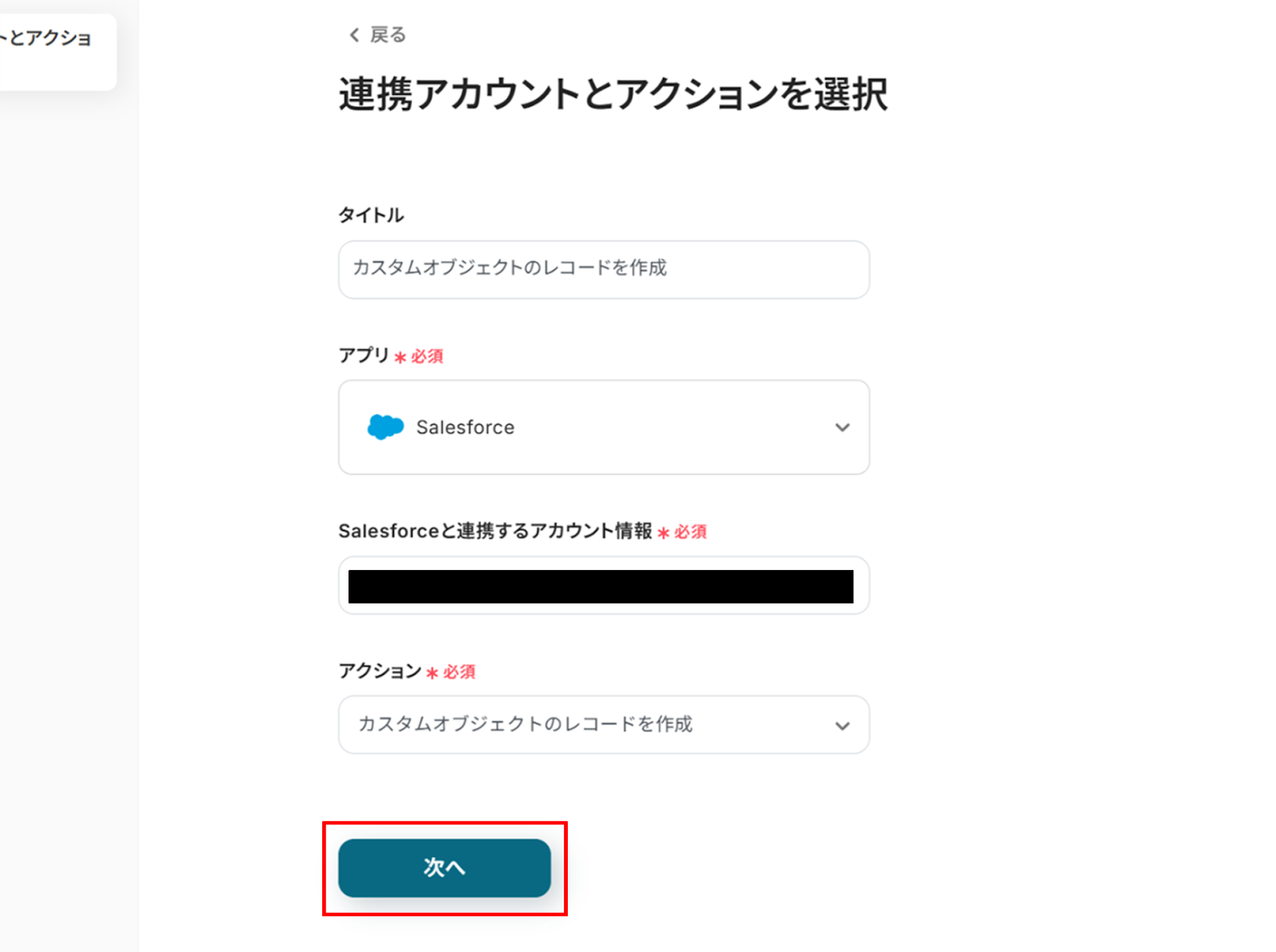 (2)「連携アカウントとアクションを選択」画面から、Salesforceと連携するアカウント情報に誤りがないかを確認し、アクションは「カスタムオブジェクトのレコードを作成」のままで「次へ」をクリックします。