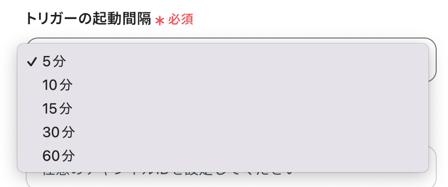 「トリガーの起動間隔」を5分・10分・15分・30分・60分から選択します。