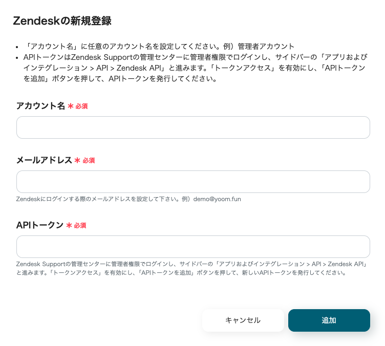 取得した値を使って必須項目を入力して「追加」ボタンをクリックすると、Zendeskのマイアプリ登録が完了します。
