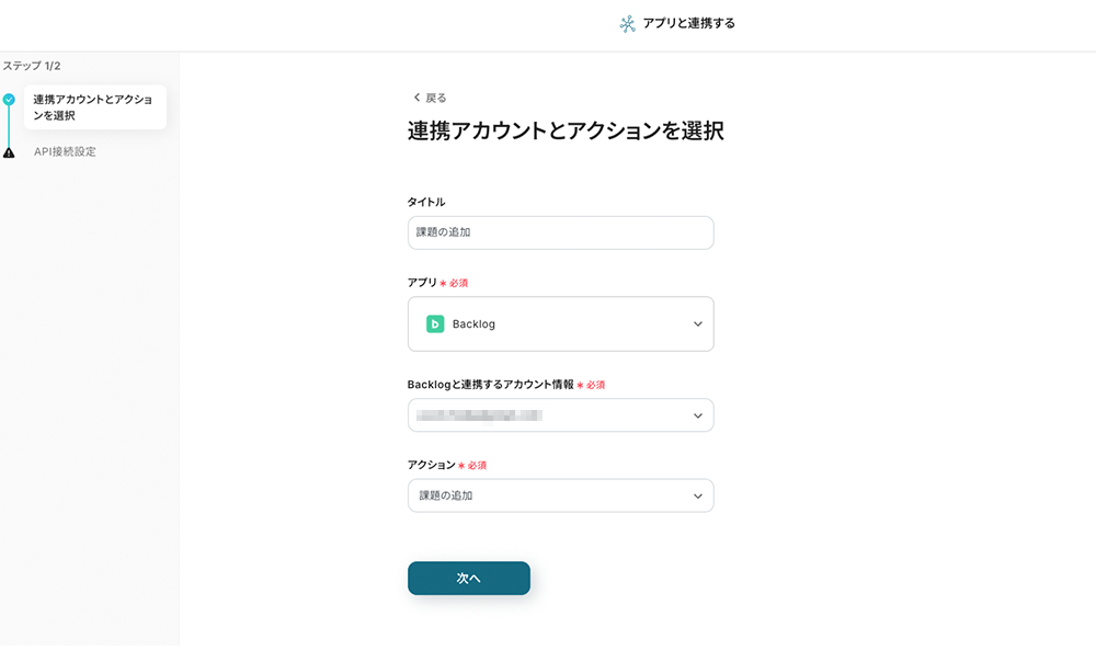 タイトルと連携するアカウント情報を設定し、アクションはテンプレート通りのまま「次へ」をクリックして進んでください。