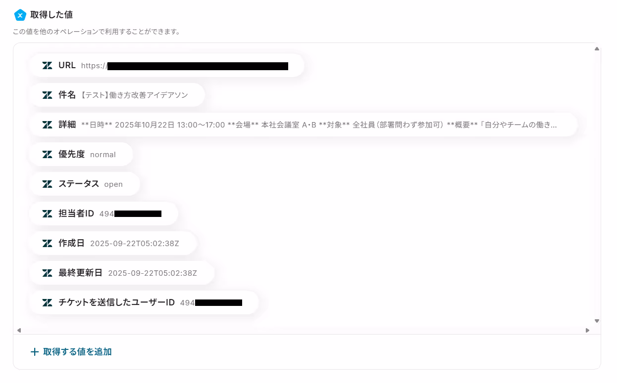 A:カスタムフィールドを取得することも可能です。トリガーアクションの取得した値の下部にある「+取得する値を追加」から、カスタムフィールドの設定を行ってください。