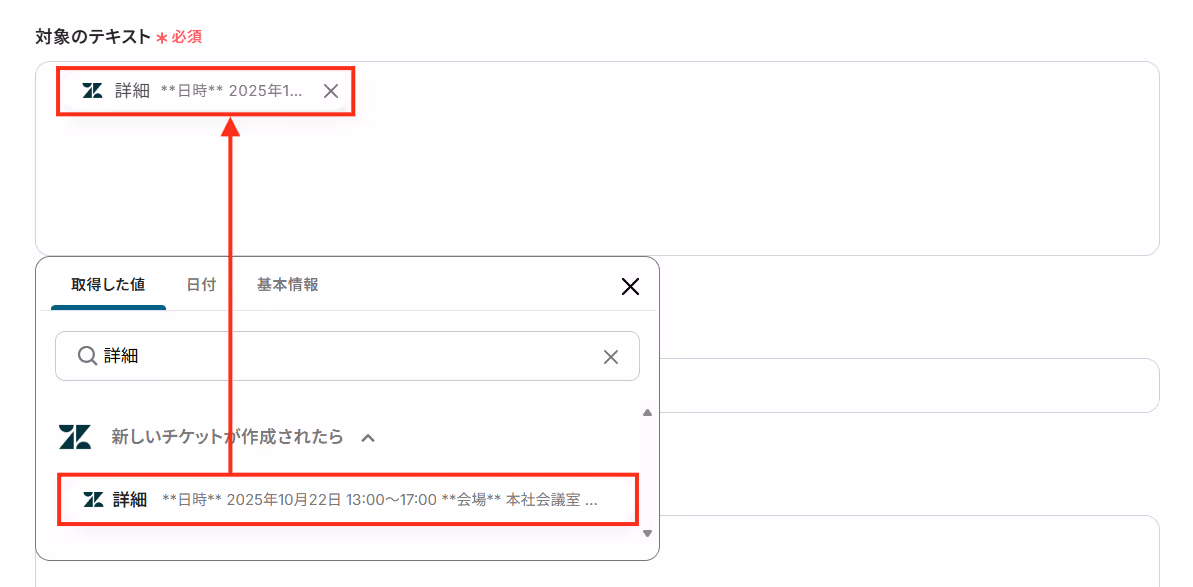 A:参考画像にもあったように、データ抽出アクションの「指示内容」にどのような形式で出力するかを設定することで、Googleカレンダーに連携可能な日付データを抽出できます。また、チケットの日付情報は年月日と時間を全て記載することをおすすめします。