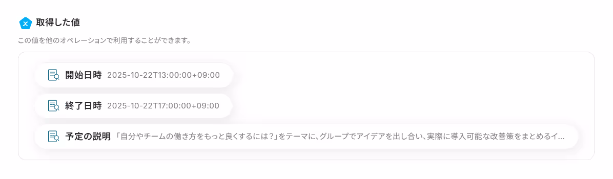 こうして取得したカスタムフィールドをGoogleカレンダーの「予定の説明」などに追加することで、連携できる項目の幅を広げられるでしょう。