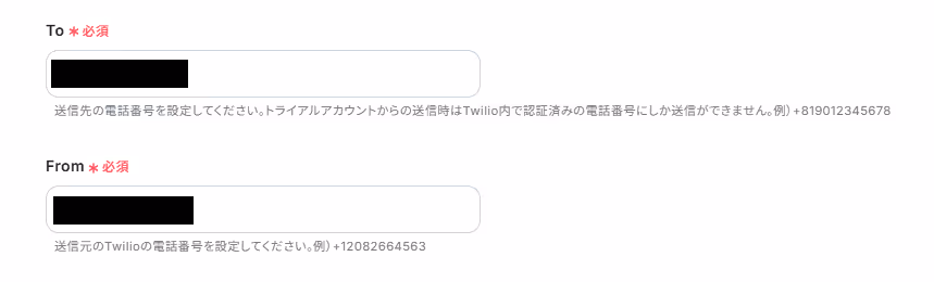 注釈に沿って、「To」と「From」に電話番号を入力してください。