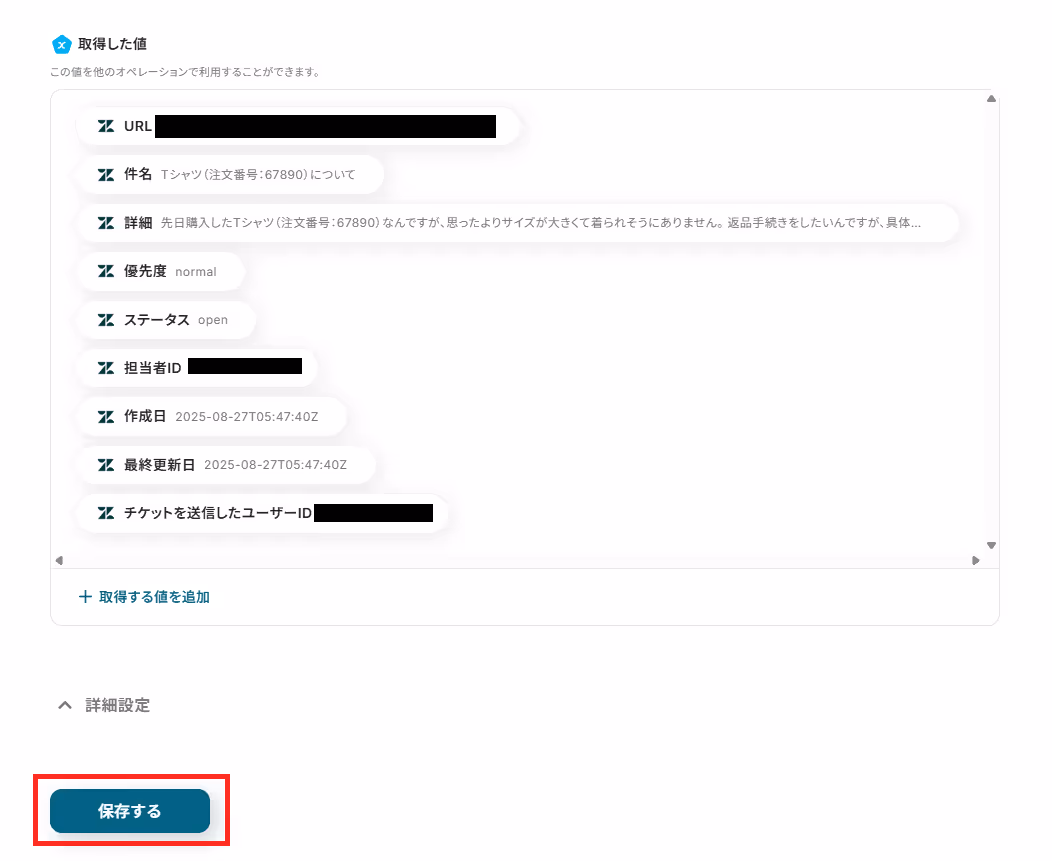 テストが成功すると、下記のような取得した値が表示されます。チケットの内容が反映していればOKです。