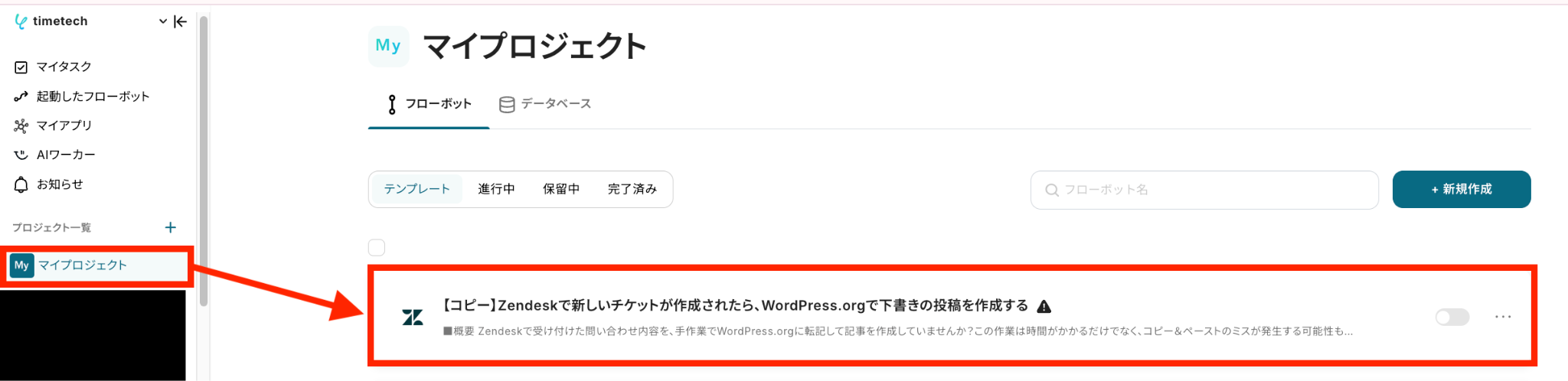 左側にあるメニューの「マイプロジェクト」から、コピーしたテンプレートを開きます。