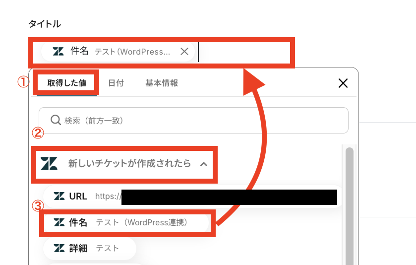 - 最後に、オペレーションでWordPress.orgの「新規投稿を作成」アクションを設定し、チケットの情報を基に下書き投稿が作成されるようにします。