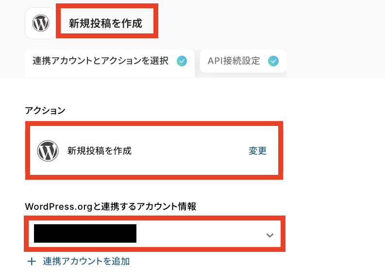 - 最後に、WordPress.orgを選択し、「新規投稿を作成する」アクションを設定し、ChatGPTが生成したテキストを本文として下書き投稿を作成します。