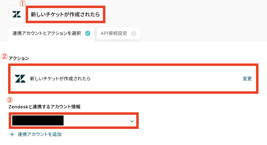 ③Zendeskと連携するアカウント情報:ステップ1で連携したアカウントが表示されていることを確認しましょう。