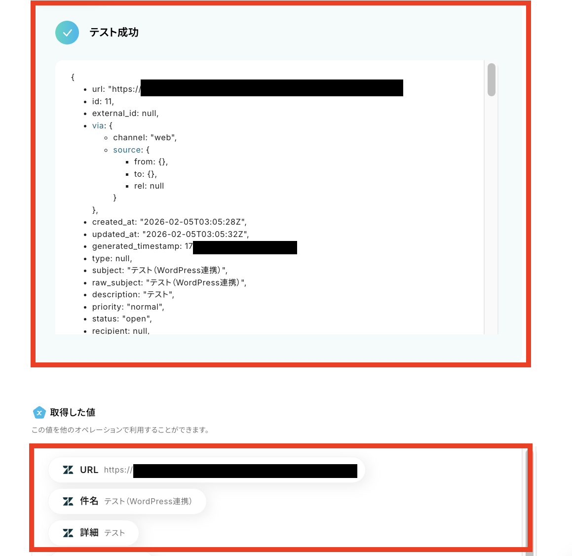 テストに成功すると、先ほど作成したZendeskのチケットデータが「取得した値(※)」の欄に反映されるので、確認できたら「完了」をクリックしてください。