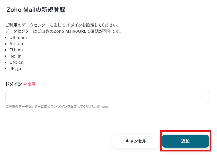 Zoho上でお使いのデータセンターに応じて、ドメインを登録します。